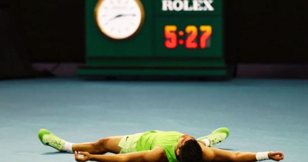 মেলবোর্ন পার্কে হয়েছিল ইতিহাসের অনন্য এক লড়াই। শুক্রবার (৩০ জানুয়ারি), মেলবোর্নের রড লেভার অ্যারেনায় কার্লোস আলকারাজ এক অসাধারণ পারফরম্যান্স উপহার দিয়ে ক্যারিয়ারের প্রথম অস্ট্রেলিয়ান ওপেনের ফাইনালে প্রবেশ করেন। এই ম্যাচে তিনি দীর্ঘ পাঁচ ঘণ্টা ২৭ মিনিট ধরে অসাধারণ ধৈর্য্য ও সাহসের পরিচয় দিয়ে ৬-৪, ৭-৬ (৫), ৬-৭ (৩), ৬-৭ (৪), ৭-৫ সেটের দীর্ঘ যুদ্ধে আলেকজান্ডার জভেরেভকে পরাজিত করেন। এটি শুধুই এক জয়ের গল্প নয়; এটি ছিল একটি কিংবদন্তির জন্মের গল্প।