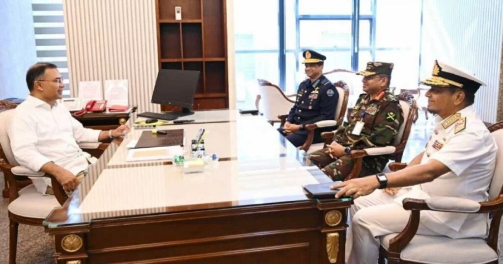 প্রধানমন্ত্রীর দায়িত্ব গ্রহণের দ্বিতীয় কার্যদিবসে, তিনি দেশের জাতীয় নিরাপত্তা ও প্রতিরক্ষা ব্যবস্থা ব্যবস্থাপনার জন্য উচ্চ পর্যায়ের আলোচনা করেছেন। আজ বৃহস্পতিবার সকালে সচিবালয়ে তার নতুন দাপ্তরিক কার্যালয়ে বেশ গুরুত্বপূর্ণ এই সাক্ষাৎ ও বৈঠক অনুষ্ঠিত হয়। বৈঠকে সেনাবাহিনী প্রধান জেনারেল ওয়াকার-উজ-জামান, নৌবাহিনী প্রধান অ্যাডমিরাল মোহাম্মদ নাজমুল হাসান এবং বিমানবাহিনী প্রধান এয়ার চিফ মার্শাল হাসান মাহমুদ খাঁন উপস্থিত ছিলেন। তারা দেশের বর্তমান নিরাপত্তা পরিস্থিতি নিয়ে বিস্তারিত আলোচনা করেন এবং ভবিষ্যতের পরিকল্পনা নিয়ে মতবিনিময় করেন।