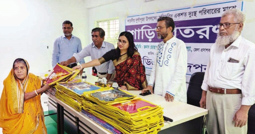 শারদীয় দুর্গোৎসবের উপলক্ষ্যে ফরিদপুরে সমাজের হতদরিদ্র ও সনাতন ধর্মাবলম্বীদের জন্য বিশেষ শাড়ি বিতরণের উদ্যোগ গ্রহণ করেছে ফরিদপুর ডেভেলপমেন্ট এজেন্সি (এফডিএ)। বৃহস্পতিবার সকালে ফরিদপুর সদর উপজেলার টেপুরাকান্দী এলাকায় এফডিএর কার্যালয়ে এ অনুষ্ঠানের আয়োজন করা হয়। এই আয়োজন এলাকার হতদরিদ্র মানুষ, বিশেষ করে সনাতন সম্প্রদায়ের নারী-পুরুষদের জন্য এক গুরুত্বপূর্ণ আলোর দ্যুতি ছড়িয়ে দেয়। নিজস্ব অর্থায়নে এই শাড়ি বিতরণ কর্মসূচির প্রধান অতিথি ছিলেন ফরিদপুরের অতিরিক্ত জেলা প্রশাসক (অর্থ ও শিক্ষা) সুস্মিতা সাহা। অনুষ্ঠানে সভাপতিত্ব করেন এফডিএর নির্বাহী পরিচালক আবু ছাহের আলম। এতে বিশেষ অতিথি হিসেবে উপস্থিত ছিলেন বিশিষ্ট এনজিও ব্যক্তিত্ব ও এফডিএর প্রতিষ্ঠাতা মো. আজহারুল ইসলাম এবং ফরিদপুর প্রেসক্লাবের সাধারণ সম্পাদক মাহাবুব হোসেন পিয়াল। পরে, শতাধিক হতদরিদ্র হরিজন সম্প্রদায় ও সনাতন ধর্মাবলম্বীদের মাঝে বিশাল এই শাড়ি বিতরণের মাধ্যমে উৎসবের মেজাজ আরো প্রাণবন্ত হয়। এ ধরনের উদ্যোগ সমাজের দুর্বল ও অধীনে থাকা মানুষের মাঝে সৌহার্দ্য ও সাম্প্রদায়িক সম্প্রীতির বার্তা পৌঁছে দেয়।