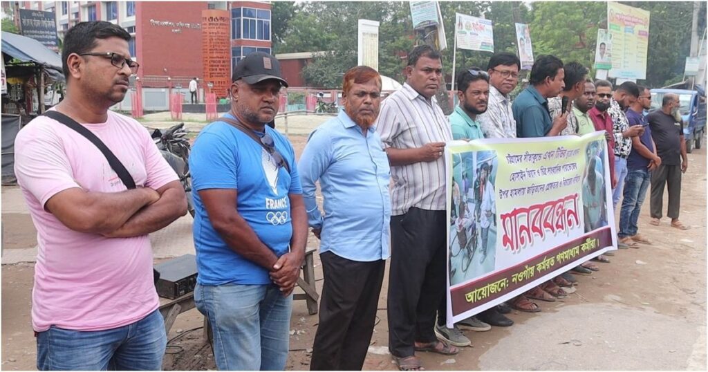 নওগাঁয় সাংবাদিকের ওপর সন্ত্রাসী হামলার প্রতিবাদে মানববন্ধন