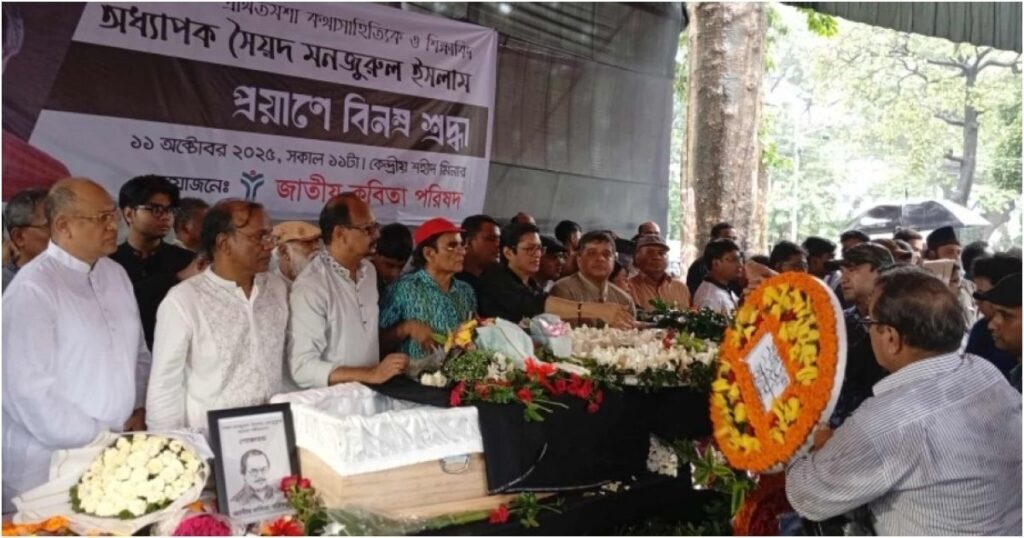 শেষযাত্রায় সহকর্মী ও বিভিন্ন সামাজিক সংগঠনের সদস্যরা শ্রদ্ধা ও ভালোবাসায় ভাসলেন লেখক ও শিক্ষাবিদ সৈয়দ মনজুরুল ইসলামের अंतिम বিদায় অনুষ্ঠানে। তার মৃত্যুতে শুধু পরিবার-পরিজনই নয়, বিপুল সংখ্যক সহকর্মী, ছাত্র, সরকারী পরামর্শদাতা, লেখক, রাজনীতিবিদ ও বিভিন্ন সামাজিক সংগঠনের নেতৃবৃন্দও শোকের ছায়া নেমে আসে।