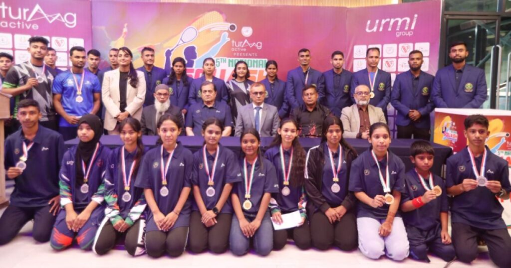 এক জাকজমকপূর্ণ আয়োজনে অনুষ্ঠিত হলো ৫ম জাতীয় স্কোয়াশ চ্যাম্পিয়নশীপ ২০২৫-এর সমাপনী ও পুরস্কার বিতরণী অনুষ্ঠান। এটি উদ্বোধন করেন যুব ও ক্রীড়া মন্ত্রণালয়ের সচিব মোঃ মাহবুব-উল-আলম। বসুন্ধরা স্পোর্টস সিটির জুলকান ইনডোর এরিনায় অনুষ্ঠিত এই প্রতিযোগিতায় বিভিন্ন বিভাগে বিভিন্ন বয়সী খেলোয়াড়রা অংশ নেন। মহিলা শাখায় অনুর্ধ ১৩ গ্রুপে চ্যাম্পিয়ন হন অনুর্ধ ১৩ বছর বয়সী অনুরিকা সুলতানা, অনুর্ধ ১৫ গ্রুপে মায়ানুর, এবং উন্মুক্ত মহিলা গ্রুপে চাঁদনী সরকার। ছেলেদের শাখায় অনুর্ধ ১৩ গ্রুপে শাহরিয়ার নাফিজ, অনুর্ধ ১৫ গ্রুপে মেহেদি হাসান, পুরুষ উন্মুক্ত গ্রুপে জয় লাভ করেন শাহাদাৎ হোসেন। এছাড়া, মেম্বার গ্রুপের চ্যাম্পিয়ন হন চট্রগ্রাম ক্লাবের ফজলে ওয়ালি এবং বিশেষ পুরস্কার পেয়ে থাকেন ঢাকা স্কোয়াশ একাডেমির জিহাদ। বিজয়ীদের হাতে ট্রফি তুলে দেন যুব ও ক্রীড়া মন্ত্রণালয়ের সচিব মোঃ মাহবুব-উল-আলম। অনুষ্ঠানে উপস্থিত ছিলেন জাতীয় স্পোর্টস কাউন্সিলের নির্বাহী পরিচালক কাজী নজরুল ইসলাম, স্কোয়াশ ফেডারেশনের সাধারণ সম্পাদক ব্রিগেডিয়ার জেনারেল জি এম কামরুল ইসলাম, স্কোয়াশ ফেডারেশনের অন্যান্য সদস্যগণ, পরিচালকদের মধ্যে মেজর (অবঃ) মোহসিনুল করিম, প্রাক্তন ও বর্তমান খেলোয়াড়, পাশাপাশি অভিভাবকগণ। চার দিনব্যাপী এই প্রতিযোগিতা শুরু হয় ১৩ অক্টোবর, যা উদ্বোধন করেন যুব ও ক্রীড়া উপদেষ্টা আসিফ মাহমুদ সজীব ভূইয়া। প্রধান অতিথি বলেন, বসুন্ধরা গ্রুপ নিজস্ব নানা কর্মকাণ্ডের পাশাপাশি খেলাধুলা ও সামাজিক কর্মকাণ্ডে পৃষ্ঠপোষকতা অব্যাহত রাখবে। তিনি ভবিষ্যতে স্কোয়াশের উন্নয়নে আরও বেশি সহায়তা করার আশাবাদ ব্যক্ত করেন। ফেডারেশনের সাধারণ সম্পাদক বলেন, বিভিন্ন চ্যালেঞ্জের মধ্যেও গত পাঁচ বছরে আমরা পরিকল্পনা অনুযায়ী স্কোয়াশকে নতুন পর্যায়ে নিয়ে এসেছি। এ ধারা অব্যাহত থাকলে বাংলাদেশ স্কোয়াশ আন্তর্জাতিক অঙ্গনে আরও ভালো করতে পারবে। তিনি উল্লেখ করেন, পরবর্তী এসএ গেমসে আমাদের লক্ষ্য মানসম্পন্ন দল পাঠানো এবং পদক জয় করা।