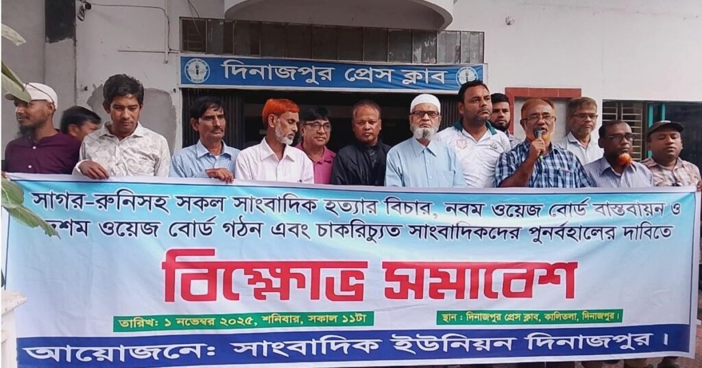 দিনাজপুরে সাংবাদিক ইউনিয়নের উদ্যোগে এক বিক্ষোভ সমাবেশ অনুষ্ঠিত হয়েছে। এই কার্যক্রমের মাধ্যমে সাংবাদিক সমাজ তাদের বিভিন্ন দাবিপূরণের জন্য ঐক্যবদ্ধ হয়ে শান্তিপূর্ণ উপায়ে প্রতিবাদ জানিয়েছেন। মূল বিষয়গুলো হলো সাগর-রুনিসহ অন্যান্য সকল সাংবাদিক হত্যার বিচার, নবম ও দশম ওয়েজ বোর্ডের বাস্তবায়ন, নতুন ওয়েজ বোর্ড গঠন এবং চাকরিচ্যুত সাংবাদিকদের পুনর্বহালের দাবী। ফেডারেল সাংবাদিক ইউনিয়ন (বিএফইউজে)-এর ঘোষিত কর্মসূচির অংশ হিসেবে এই বিক্ষোভের আয়োজন করে সাংবাদিক ইউনিয়ন দিনাজপুর। শনিবার (১ নভেম্বর) সকাল ১১টায় দিনাজপুর প্রেসক্লাবের সামনে এই সমাবেশ অনুষ্ঠিত হয়। সভাপতিত্ব করেন সাংবাদিক ইউনিয়ন দিনাজপুরের সভাপতি অধ্যাপক সাদাকাত আলী খান। সঞ্চালক হিসেবে ছিলেন ইউনিয়নের সহ সাধারণ সম্পাদক মাহবুবুল হক খান। বক্তব্য রাখেন জেলা বিএনপি’র তথ্য ও প্রচার বিষয়ক সম্পাদক মোঃ মঞ্জুর মুর্শেদ সুমন, সাধারণ সম্পাদক মোঃ মাহফিজুল ইসলাম রিপন, সহ-সভাপতি মোঃ ফারুক হোসেন, অর্থ সম্পাদক আব্দুস সালাম, দৈনিক বাংলার জেলা প্রতিনিধি মিজানুর রহমান প্রমুখ। বক্তারা বলেন, সাগর-রুনিসহ অন্যান্য সাংবাদিক হত্যার সুবিচার না হলে আন্দোলন অব্যাহত থাকবে। নবম ও দশম ওয়েজ বোর্ডের দ্রুত বাস্তবায়ন, নতুন ওয়েজ বোর্ড গঠন, চাকরিচ্যুত সাংবাদিকদের পুনর্বহাল এবং সাংবাদিকদের জন্য ২১ দফা দাবি মেনে নেওয়ার জন্য সরকারের প্রতি জোর দাবি জানানো হয়। বক্তারা আরও বলেন, শুধু কথাই নয়, দাবি মানানোর জন্য কার্যকর পদক্ষেপ নেওয়া জরুরি, যাতে দাবি পূরণ হয় এবং সাংবাদিক সমাজ এবং দেশের স্বার্থ রক্ষা হয়। এই সমাবেশে উপস্থিত ছিলেন সাংবাদিক সালাহ উদ্দিন আহেমদ, স্বপ্ন মৃধা, আবুল ওহাব, লুৎফর রহমান, সাজেদুর রহমান নওশাদ, মামুনুর রশিদ বিপ্লব, মেনহাজুল ইসলাম, মোঃ ইসমাইল হোসেন এবং অন্যান্যরা।