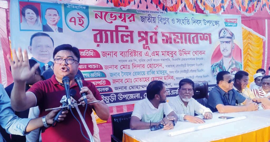 বিএনপি চেয়ারপারসনের উপদেষ্টা, সুপ্রিম কোর্ট বার অ্যাসোসিয়েশনের সভাপতি এবং নোয়াখালী-১ আসনের সাবেক সংসদ সদস্য ব্যারিস্টার মাহবুব উদ্দিন খোকন বলেছেন, আগামী নির্বাচনে আমাদেরকে বিভিন্ন চ্যালেঞ্জ মোকাবিলা করতে হবে। কোন ধরনের ষড়যন্ত্র বা প্ররোচনাকে ঐক্যবদ্ধভাবে এবং সাহসের সাথে মোকাবিলা করতে হবে। তিনি আরও বলেন, পূর্বে আন্দোলন সংগ্রামের মাধ্যমে, আমাদের অনেক নেতাকর্মী জীবন উৎসর্গ করেছেন। নোয়াখালী-১ আসনে ২২ জন নেতা-কর্মী নিহত ও অনেকে আহত হয়েছেন, যা আমাদের জন্য অত্যন্ত দুঃখজনক। শুক্রবার বিকেলে সোনাইমুড়ী রেলওয়ে চত্বরে জাতীয় বিপ্লব ও সংহতি দিবস উপলক্ষে অনুষ্ঠিত এক আলোচনা সভায় তিনি এসব কথা বলেন। বক্তা হিসেবে উপস্থিত ছিলেন উপজেলা বিএনপির আহ্বায়ক দিদার হোসেন। সভায় সভাপতিত্ব করেন পৌরসভা বিএনপির আহ্বায়ক মোতাহের হোসেন মানিক। অনুষ্ঠানের সঞ্চালনায় ছিলেন উপজেলা বিএনপির যুগ্ম আহ্বায়ক মাসুদ আলম ফরহাদ। বিশেষ অতিথি হিসেবে উপস্থিত ছিলেন পৌর বিএনপির সদস্য সচিব রেজা ইয়াসির মাহবুব। আরও বক্তব্য রাখেন উপজেলা বিএনপির যুগ্ম আহ্বায়ক আব্দুল গণি পাটোয়ারী মামুন, মাসুদ রহমান, ফখরুল আলম, লুৎফুর রহমান ও পৌরসভা বিএনপির যুগ্ম আহ্বায়ক জালাল আহমেদ।