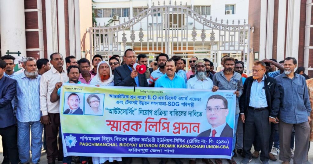 ফরিদপুরে বিদ্যুৎ বিতরণ ব্যবস্থা সংস্কারের নামে আউটসোর্সিং প্রক্রিয়ার মাধ্যমে জনবল নিয়োগের বিরুদ্ধে নিয়মিত বিক্ষোভ ও সমাবেশ করেছে স্থানীয় শ্রমিকেরা। মঙ্গলবার সকালে ফরিদপুর শহরের জেলখানা গেটসংলগ্ন এলাকায় এই বিক্ষোভ মিছিল শুরু হয়, যা পরে শহরের বিভিন্ন সড়ক ঘুরে জেলা প্রশাসকের কার্যালয়ে এসে শেষ হয়। এই প্রতিবাদে নেতৃত্ব দিচ্ছেন ওয়েস্ট জোন পাওয়ার ডিস্ট্রিবিউশন কোম্পানির কেন্দ্রিয় শ্রমিক সংগঠনের সিনিয়র যুগ্ম সম্পাদক ও ফরিদপুর জেলা শাখার সভাপতি খন্দকার আবদুল আউয়াল। এরপর তারা জেলা প্রশাসকের কাছ থেকে দাবির পত্র সহ স্মারকলিপি প্রদান করেন। এই সময় উপস্থিত ছিলেন শ্রমিক নেতারা, সহসঙ্গে অন্যান্য শ্রমিক কর্মীরা। স্মারকলিপিতে বলা হয়েছে, বিগত ১৭ বছরে ওয়েস্ট জোন পাওয়ার ডিস্ট্রিবিউশনের আওতায় কোনও কারিগরি লোকবল নিয়োগ হয়নি। ফলে, ২১ জেলার বিদ্যুৎ বিতরণের কার্যক্রম অপ্রশিক্ষিত বা বহিরাগতদের উপর নির্ভরশীল হয়ে পড়েছে, যা গ্রাহক সেবার মানের অবনতি সাধন করেছে। শ্রমিক নেতারা একযোগে দাবি জানিয়েছেন যে, অপ্রেইক্ষে আউটসোর্সিং চালু রাখা বন্ধ করে দ্রুত স্থায়ী শ্রমিক নিয়োগের ব্যবস্থা করা হোক। তারা এই বিষয়ে ফরিদপুরের ডিসির মাধ্যমে বিদ্যুৎ, জ্বালানি ও খনিজ সম্পদ মন্ত্রণালয়ের উপদেষ্টাকে স্মারকলিপি জমা দেয়ার প্রত্যাশা ব্যক্ত করেছেন। শ্রমিক নেতারা বলেন, স্বৈরাচারী সরকারের বিদ্যুৎ বিভাগের দপ্তরে যারা দোষী, তাদের মদদেই এই পরিস্থিতি সৃষ্টি হয়েছে এবং এতে সাধারণ গ্রাহকদের সেবা ব্যাহত হচ্ছে। তারা দ্রুত এই দুর্ভোগ থেকে মুক্তি পেতে বাস্তবায়নের দাবি জানান।