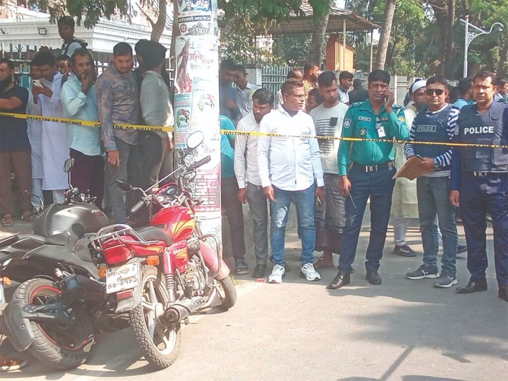 খুলনায় আদালতের সামনে প্রকাশ্যে দুজনকে গুলি করে এবং কুপিয়ে হত্যা করেছে দুর্বৃত্তরা। এই ঘটনাটি ঘটেছে গতকাল রোববার দুপুর সাড়ে ১২টার সময় খুলনা মহানগর দায়রা জজ আদালতের সামনে। প্রত্যক্ষদর্শীরা জানিয়েছেন, ঘটনাটি ঘটে যখন মহানগর দায়রা জজ আদালতে একটি অস্ত্র মামলার হাজিরা দিতে আসেন রূপসার বাগমারা এলাকার দুই যুবক, রাজন ও হাসিব। তারা জামিনে মুক্ত থাকায় আদালত ফটকের সামনে মোটরসাইকেল রেখে চা পান করতে দাঁড়িয়েছিলেন। তখন চার থেকে পাঁচজন অজ্ঞাত ব্যক্তি হেঁটে আসেন এবং তাদের লক্ষ্য করে গুলি ছোড়েন। গভীর গুলির আঘাতে দুজনই মাটিতে পড়ে যান, এরপর দুর্বৃত্তরা চাপাতি দিয়ে এলোপাতাড়ি কুপিয়ে আহত করে। পরে তারা দ্রুত ঘটনাস্থল থেকে পালিয়ে যায়। আহত দুজনকে উদ্ধার করে খুলনা মেডিকেল কলেজ হাসপাতালে নিয়ে যাওয়া হলে চিকিৎসকরা তাদের মৃত ঘোষণা করেন। এই ঘটনার সঙ্গে সংশ্লিষ্ট কর্মকর্তারা ঘটনাস্থল পরিদর্শন করেছেন এবং পুলিশ ও বিভিন্ন গোয়েন্দা সংস্থা তদন্তের জন্য কাজ শুরু করেছে। এ ঘটনায় পুরো আদালত চত্বরে ব্যাপক আতঙ্ক ছড়িয়ে পড়ে এবং বিভিন্ন আইনজীবী ও জনসাধারণের মধ্যে উদ্বেগের সৃষ্টি হয়। খুলনা সদর থানার ওসি শফিকুল ইসলাম বলেছেন, ‘জামিনে থাকা দুই আসামি হাজিরা শেষে আদালত ফটকের সামনে মোটরসাইকেল রেখে দাঁড়িয়েছিলেন, এ সময় চার থেকে পাঁচজন হামলাকারী এসে তাদের লক্ষ্য করে গুলি চালায়।’ এই הנодটির ঘটনার ব্যাপারে তদন্ত চলছে এবং দোষীদের খুঁজে বের করতে প্রক্রিয়া underway।