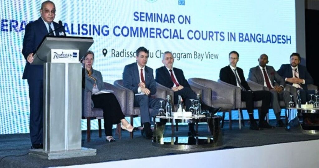 গত শনিবার চট্টগ্রামে জাতিসংঘ উন্নয়ন কর্মসূচি (ইউএনডিপি) এবং বাংলাদেশ সুপ্রিম কোর্টের যৌথ উদ্যোগে বিশেষ এক সেমিনার অনুষ্ঠিত হয়, যেখানে দেশের অর্থনীতির গুরুত্বপূর্ণ পাশাপাশি নতুন দিগন্ত উন্মোচনের জন্য বাণিজ্যিক আদালত প্রতিষ্ঠার পরিকল্পনা আলোচনায় উঠে আসে। এই উদ্যোগের মূল লক্ষ্য হলো দীর্ঘ সময় ধরে চলমান ব্যবসায়িক বিরোধ ও জটিলতা সমাধানে সহায়ক হবে এমন বিশেষায়িত আদালত প্রতিষ্ঠা। আইনে বিশেষজ্ঞ, ব্যবসায়ী, বিচারপতি, সরকারি কর্মকর্তা, কূটনীতিক, উন্নয়ন সহযোগী ও অর্থনীতিবিদ অংশগ্রহণ করেন। বার্ষিক এই সভায় বিচার বিভাগ কি ধরনের কার্যকরী স্ট্রাকচার তৈরিতে এগিয়ে যেতে পারে, সে বিষয়ে বিস্তারিত আলোচনা হয়। ইউএনডিপির সংবাদ বিজ্ঞপ্তিতে জানানো হয়, এসব আদালত দেশের আর্থিক কর্মকাণ্ডে বাধা সৃষ্টি করা মামলা ঝামেলা কমিয়ে আনবে, ব্যবসায়িক কার্যক্রমের স্বচ্ছতা বৃদ্ধি করবে এবং দেশের এলডিসি থেকে উত্তরণের পথে গুরুত্বপূর্ণ ভূমিকা রাখবে। প্রধান বিচারপতি সৈয়দ রেফাত আহমেদ বলেন, এই আদালত প্রতিষ্ঠা দেশের বিচার ব্যবস্থা ও অর্থনীতির মধ্যে বিশ্বাস বাড়াবে, বিশেষ করে চট্টগ্রামের মতো গুরুত্বপূর্ণ বন্দরনগরীতে বিচার ব্যবস্থা বিকেন্দ্রীকরণে সহায়ক হবে। তিনি আইজীবী সমাজ, বিচারক ও অংশীদারদের সক্রিয় ভূমিকা পালনের আহ্বান জানান। কানাডার হাইকমিশনার অজিত সিং বলেন, দেশের অর্থনীতির উন্নয়নে এই আদালত গুরুত্বপূর্ণ সামর্থ্য যোগ করবে, বিনিয়োগকারীদের আস্থা বাড়াবে এবং কর্মসংস্থান সৃষ্টি করবে। ইউরোপীয় ইউনিয়নের রাষ্ট্রদূত মাইকেল মিলার জানান, স্বচ্ছ ও সময়োচিত বিরোধ নিষ্পত্তি বিনিয়োগকারীদের আস্থা বাড়াতে অপরিহার্য। সুইডেনের রাষ্ট্রদূত নিকোলাস উইকস বলেন, এই ব্যবস্থা আন্তর্জাতিক ব্যবসায়ীদের আস্থা বৃদ্ধি করবে এবং বাংলাদেশকে একটি প্রতিযোগিতামূলক বাজারে রূপান্তর করবে। ইউএনডিপির বাংলাদেশের আবাসিক প্রতিনিধি স্টেফান লিলার উল্লেখ করেন, বাণিজ্যিক আদালত বাংলাদেশকে বিনিয়োগের জন্য আরও নিরাপদ ও বিশ্বস্ত করে তোলার পথে সামনে এনে দিবে। অস্ট্রেলিয়ার ডেপুটি হাইকমিশনার ক্লিনটন পব্ক বলেন, বিচার বিভাগের স্বাধীনতা ও সংস্কার দিকে অগ্রসর হওয়া বাংলাদেশের জন্য গর্বের বিষয়, যা বিনিয়োগ ও অর্থনৈতিক প্রবৃদ্ধিতে সহায়ক। বিশেষজ্ঞদের প্যানেলে ছিলেন ব্যারিস্টার মারগুব কবির, ব্যারিস্টার সামীর সাত্তার, ইউএনডিপির উপসচিব ওয়াইস প্যারে, ও ডেস্ক স্পেশালিস্ট ক্রিস ডেকার। আলোচনা হয় দীর্ঘমেয়াদি মামলার জট, আইনি কাঠামো, ক্ষুদ্র ও মাঝারি উদ্যোগের জন্য প্রবেশাধিকার ও অবকাঠামোগত চাহিদা নিয়ে। অনুষ্ঠানের সঞ্চালনা করেন ইউএনডিপির সিনিয়র অ্যাডভাইজর রোমানা শভাইগার। সেম
