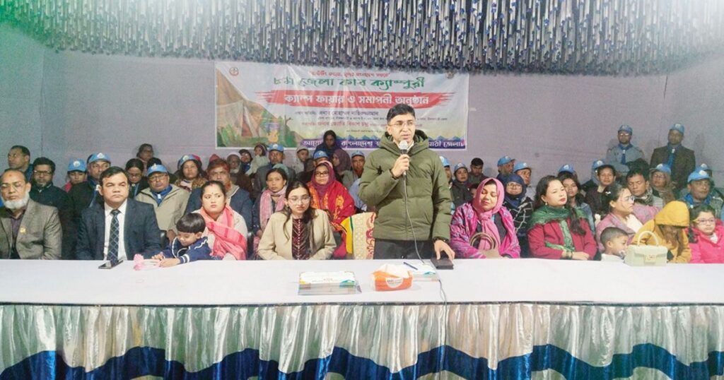 নীলফামারীতে ৮ম জেলা কাব ক্যাম্পের সফল সমাপ্তি উদযাপিত হয়েছে। এই ক্যাম্পের মূল প্রতিপাদ্য ছিল, ‘করব, সুন্দর বাংলাদেশ গড়ব’। গত রোববার (১৪ ডিসেম্বর) রাতে নীলফামারী সরকারি উচ্চবিদ্যালয় মাঠে অনুষ্ঠিত হয় অগ্নিকুণ্ডের প্রদীপ জ্বালানো, ক্যাম্পফায়ার ও সমাপনী অনুষ্ঠানের মধ্য দিয়ে ক্যাম্পের আনুষ্ঠানিক সমাপ্তি। অনুষ্ঠানে প্রধান অতিথি হিসেবে উপস্থিত ছিলেন জেলা প্রশাসক মোহাম্মদ নায়িরুজ্জামান, যিনি ক্যাম্পের উদ্দেশ্য ও গুরুত্বের কথা বলেছেন। অনুষ্ঠানে সভাপতিত্ব করেন অতিরিক্ত জেলা প্রশাসক (সার্বিক) জ্যোতি বিকাশ চন্দ্র, এবং স্বাগত বক্তব্য প্রদান করেন জেলা সাধারণ সম্পাদক আতাউর রহমান। বক্তারা উল্লেখ করেছেন, কাব স্কাউটদের নৈতিক মূল্যবোধ, শৃঙ্খলা এবং নেতৃত্ব গুণাবলি বিকাশে এই ধরনের ক্যাম্প গুরুত্বপূর্ণ ভূমিকা রাখে। তারা বলেন, such কার্যক্রম শিশু-কিশোরদের মধ্যে দেশপ্রেম, সামাজিক দায়িত্ববোধ এবং মানবিক মূল্যবোধ জাগ্রত করে। অনুষ্ঠানে জেলা স্কাউটসের বিভিন্ন পর্যায়ের নেতৃবৃন্দ, শিক্ষক, কাব স্কাউট লিডার এবং বিভিন্ন শিক্ষাপ্রতিষ্ঠানের কাব স্কাউটরা উপস্থিত ছিলেন, যারা এই ক্যাম্পের মাধ্যমে স্কাউটিং এর মূল উদ্দেশ্য ও সামাজিক মূল্যবোধের গুরুত্ব সম্পর্কে আশাবাদ প্রকাশ করেন।