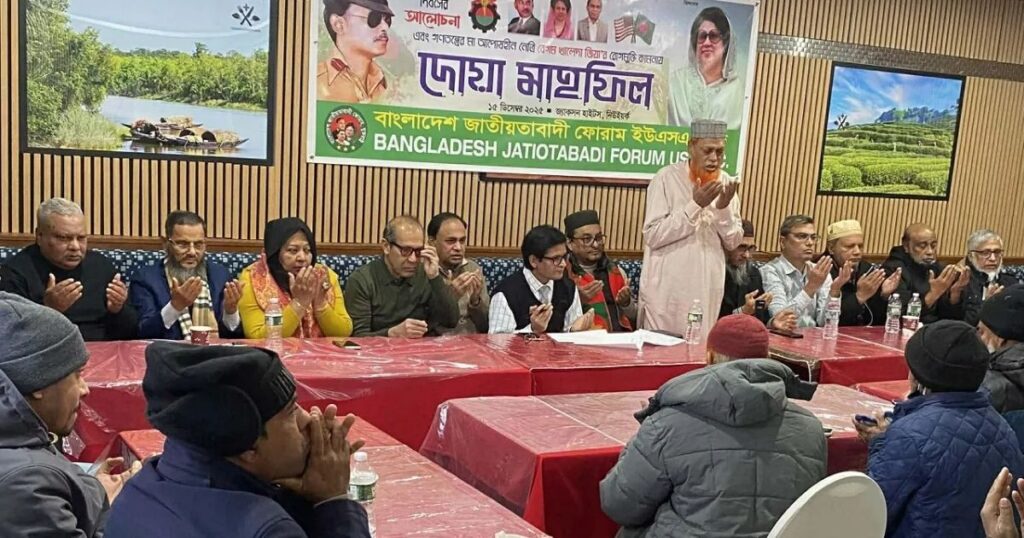 বিএনপি চেয়ারম্যান ও সাবেক প্রধানমন্ত্রী বেগম খালেদা জিয়ার স্বাস্থ্যসंबন্ধিত দ্রুত সুচিকিৎসা ও সুস্থতার জন্য শুভকামনা জানিয়ে যুক্তরাষ্ট্রের নিউইয়র্কে দোয়া মাহফিল ও আলোচনা সভা অনুষ্ঠিত হয়েছে। বাংলাদেশ জাতীয়তাবাদী ফোরাম ইউএসএ ইনক-এর উদ্যোগে এই অনুষ্ঠানে স্থানীয় ব্যাপ্তিতে গত সোমবার জ্যাকসন হাইটসের নবান্ন রেস্টুরেন্টে আয়োজন করা হয়। এই কর্মসূচির মূল উদ্দেশ্য ছিল খালেদা জিয়ার জন্য দোয়া করা ও তার সুস্থতার জন্য আল্লাহর কাছে প্রার্থনা। অনুষ্ঠানে সভাপতি ছিলেন মাহবুবুর রহমান মুকুল এবং সাধারণ সম্পাদক মোহাম্মদ আবদুল মান্নান হোসাইনের পরিচালনায়। অনুষ্ঠানে পবিত্র কোরআন তিলাওয়াত ও বিশেষ মোনাজাত পরিচালিত হয় যেখানে শহীদ প্রেসিডেন্ট জিয়াউর রহমান, তার পুত্র আরাফাত রহমান কোকো, শরিফ ওসমান হাদি এবং ৭১ ও ৭৪ সালের অসংখ্য শহীদদের আত্মার শান্তির জন্য প্রার্থনা করা হয়। সেইসঙ্গে বিএনপি নেত্রী খালেদা জিয়ার দ্রুত সুস্থতার জন্য দোয়া করা হয়। আলোচনা সভায় বক্তারা বলেছিলেন, বিজয়ের চেতনাকে আরও শক্তিশালী করতে আগামী নির্বাচনে দেশের স্বাধীকার ও গণতন্ত্রের প্রতীক বিএনপিকে বিএনপির আদর্শের প্রতীক ধানের শীষে ভোট দেওয়ার আহ্বান জানানো হয়। তারা বলেন, অশুভ ও নোংরা রাজনীতি পরিহার করে গণতন্ত্রের মূল্যবোধ ও জিয়ার আদর্শের ওপর ভিত্তি করে দলকে সুসংগঠিত করতে হবে। পাশাপাশি, ভারত ও আওয়ামী লীগের বিরুদ্ধে রাজনৈতিকভাবে মোকাবিলা করে স্বাধীন ও শক্তিশালী বাংলাদেশ গড়ার অঙ্গীকার ব্যক্ত হয় এই অনুষ্ঠানে।
